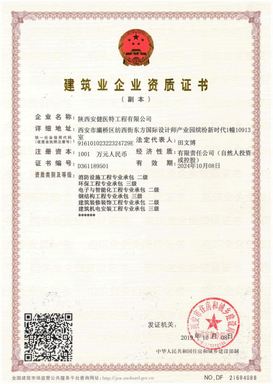 陕西安健医特工程有限公司始终坚持“以科技为先导”,不断致力于新产品、新技术、新工艺的引进与开发,以建造符合《规范》与《标准》的现代化医院建设为己任。公司拥有完整的测试仪器和专业检测机构合作,为确保每一项工程,每一项技术指标达到要求提供了保障。我们视每一项工程、每一件产品都是“安健医特的形象”。公司将以诚实守信、求真务实、服务至上、开拓创新的精神,创建医院优质工程,与社会各界真诚合作,共创辉煌。