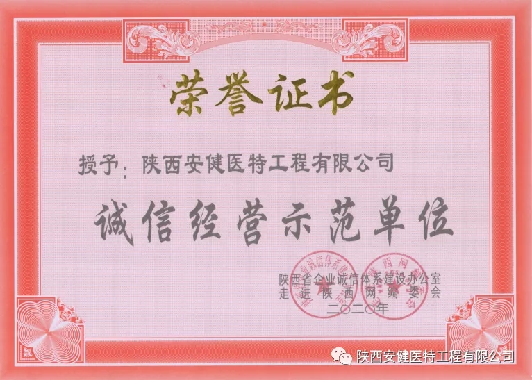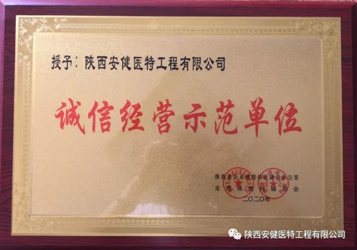 2020年5月26日荣获陕西省企业诚信体系办公室、走进陕西网编协会颁发*陕西省诚信经营示范单位*。感谢各级领导及同仁一直以来对安健医特的支持,我公司定不负众望,以诚信示人、结识天下英才,共创佳绩。