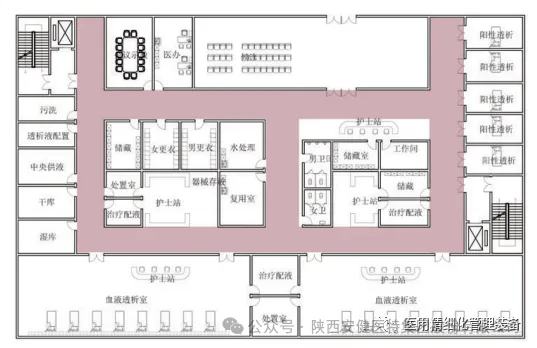 3.透析治疗区:患者接收透析治疗的区域;一般包括阴性区、阳性区及若干单间,如VIP室、急诊 CCRT室、隔离单间等,有条件可设手术室。