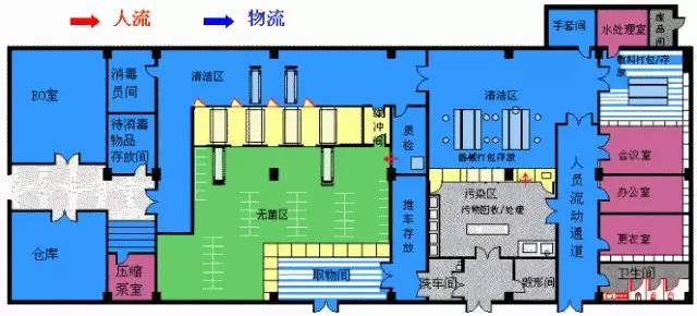 工作区域划分应遵循“物品由污到洁,不交叉、不逆流”的原则,分为去污区、检查包装灭菌区和灭菌物品存放区;去污区与检查包装灭菌区之间应设实际屏障;去污区和检查包装灭菌区均应设人员出入缓冲间(带)和物品通道。